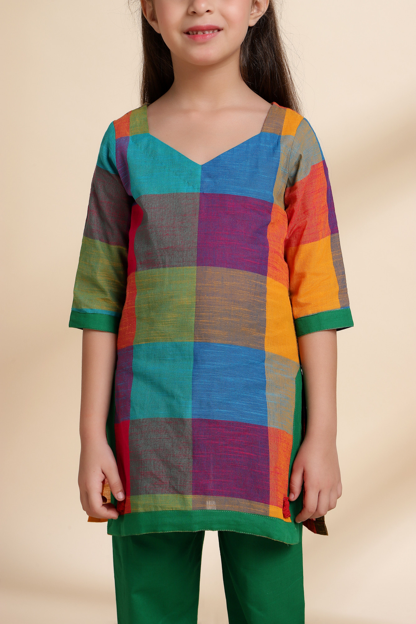 Featuring a multicolor south cotton checkered kurta with jewel neckline and crochet flowers at the hem. It comes along with bottle green cotton pants. The kurta is opaque with no lining.