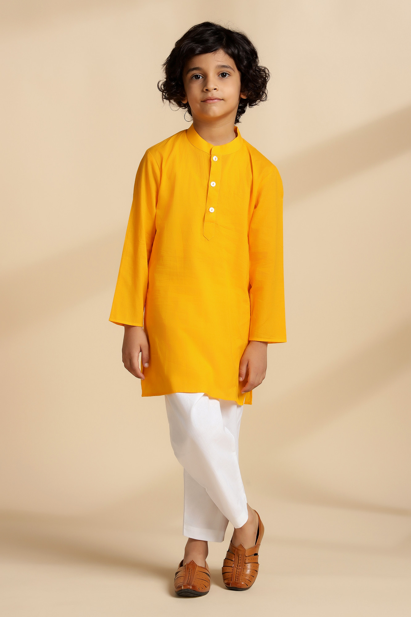 Featuring a yellow cotton kurta with pockets. It comes along with white cotton pants having elasticated waist.