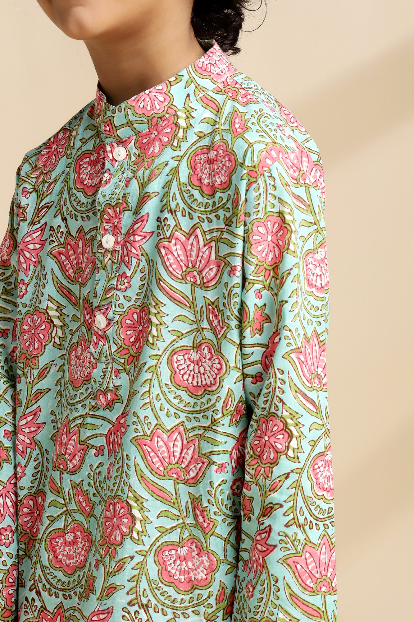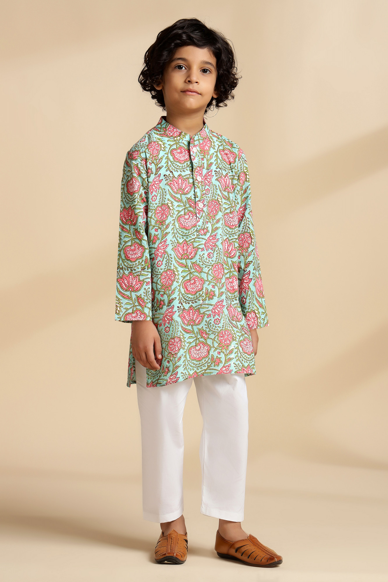Featuring a sea-green floral floral cotton kurta. It comes along with white cotton pants having elasticated waist.