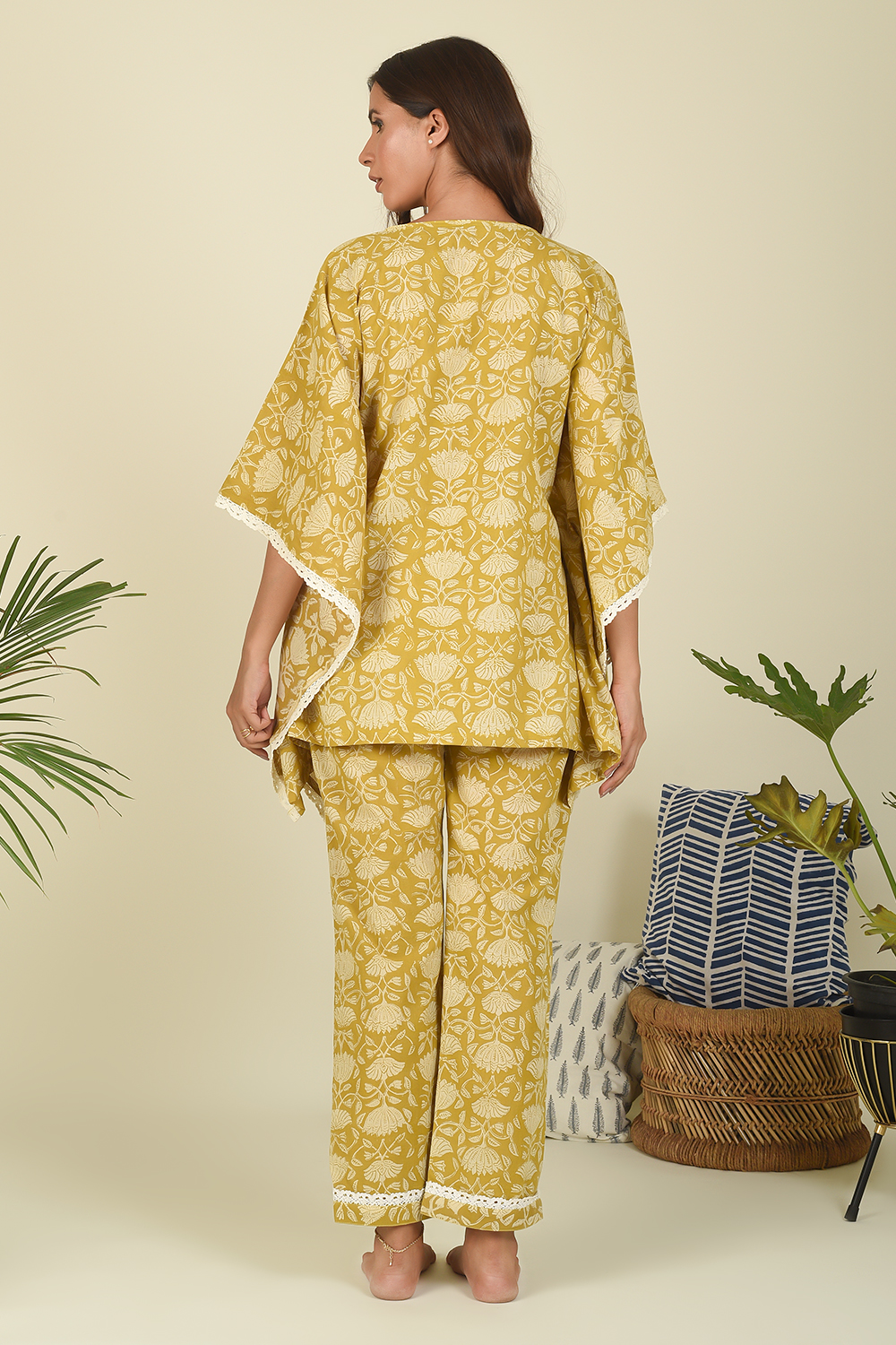 Featuring a cotton set of hand block printed kaftan with pajamas. Kaftan has front tie up having handmade crochet flowers and crochet lace detailing. Pajama has crochet lace at the hemline with drawstring having handmade crochet flowers. The set has no lining. Gently hand wash separately in cold water. Do not soak & scrub. Dry in shade.