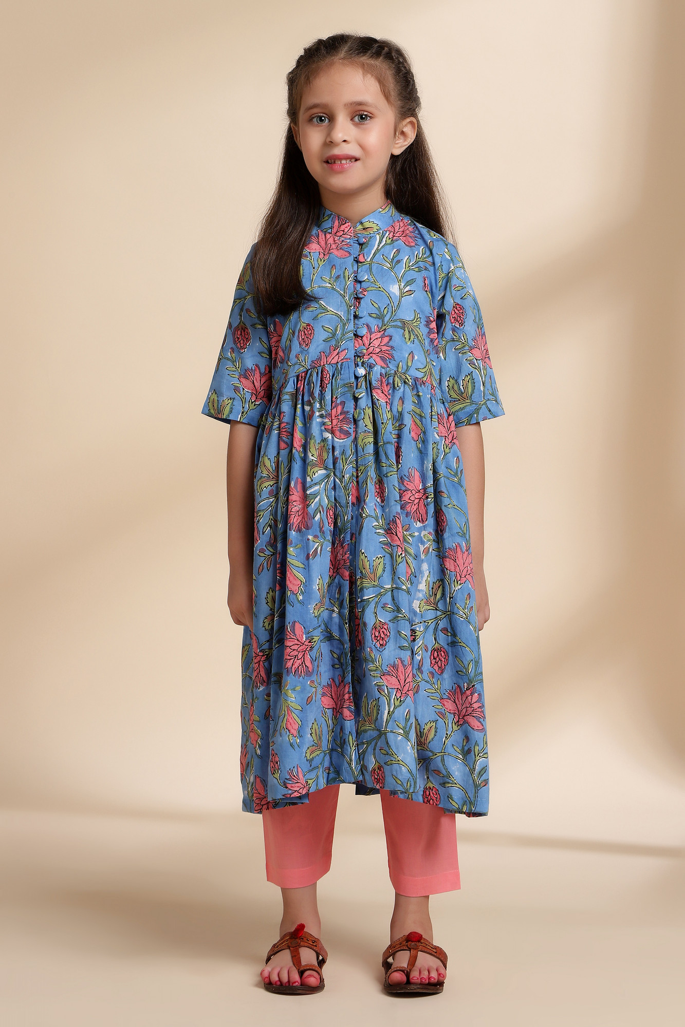 Featuring a navy floral cotton cape with front buttons. Torso of the cape is lined. It comes along with peach cotton pants.