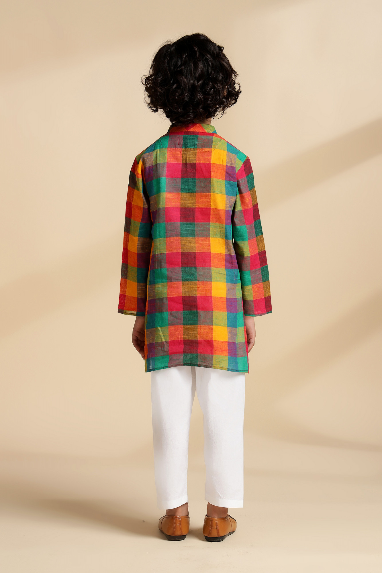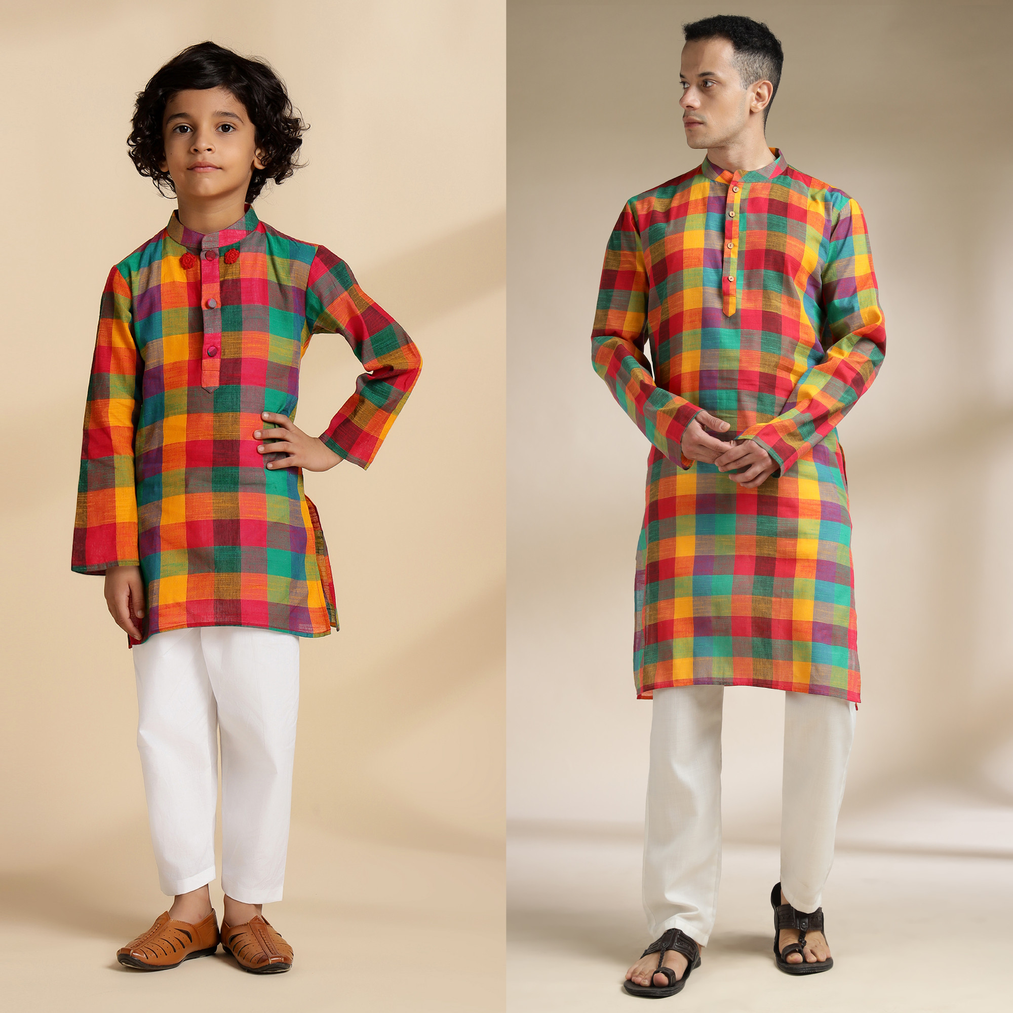 Boy's kurta set of 2: Front button closure kurta with elasticated pants.