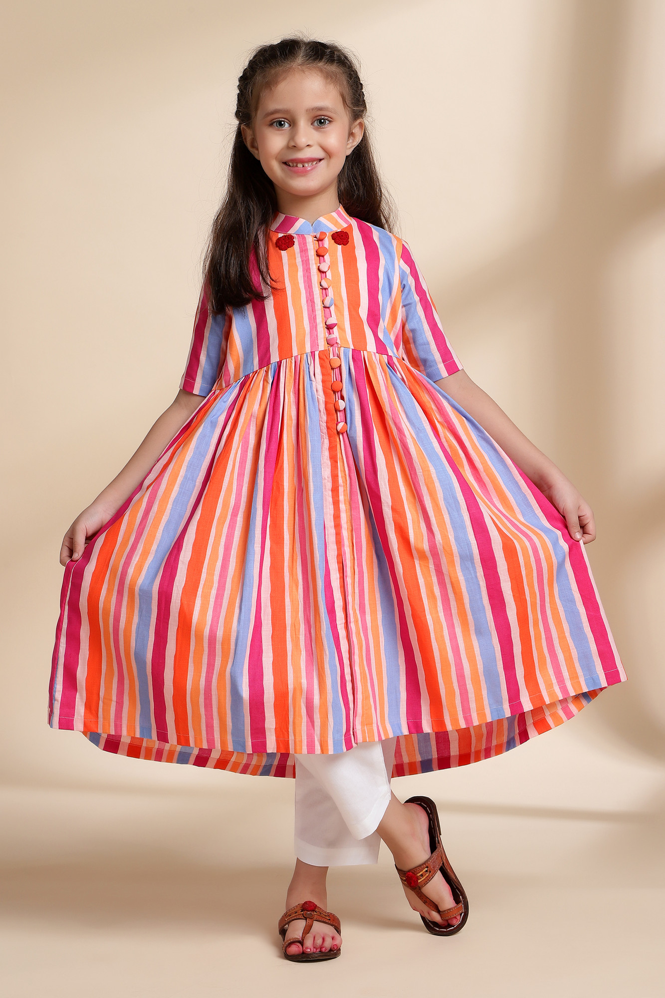 Girl's kurta set of 2: Front button closure in kurta & elasticated pants.