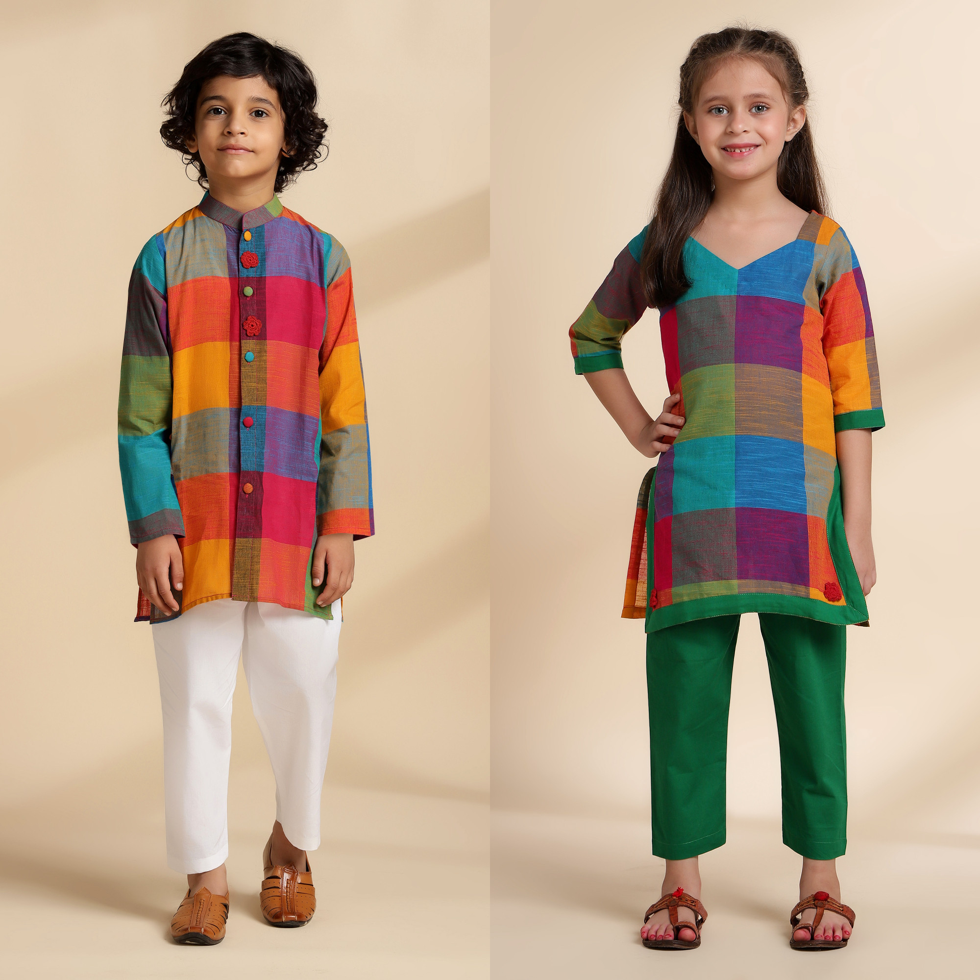 Boy's Kurta set of 2: Front button closure in kurta & elasticated pants.