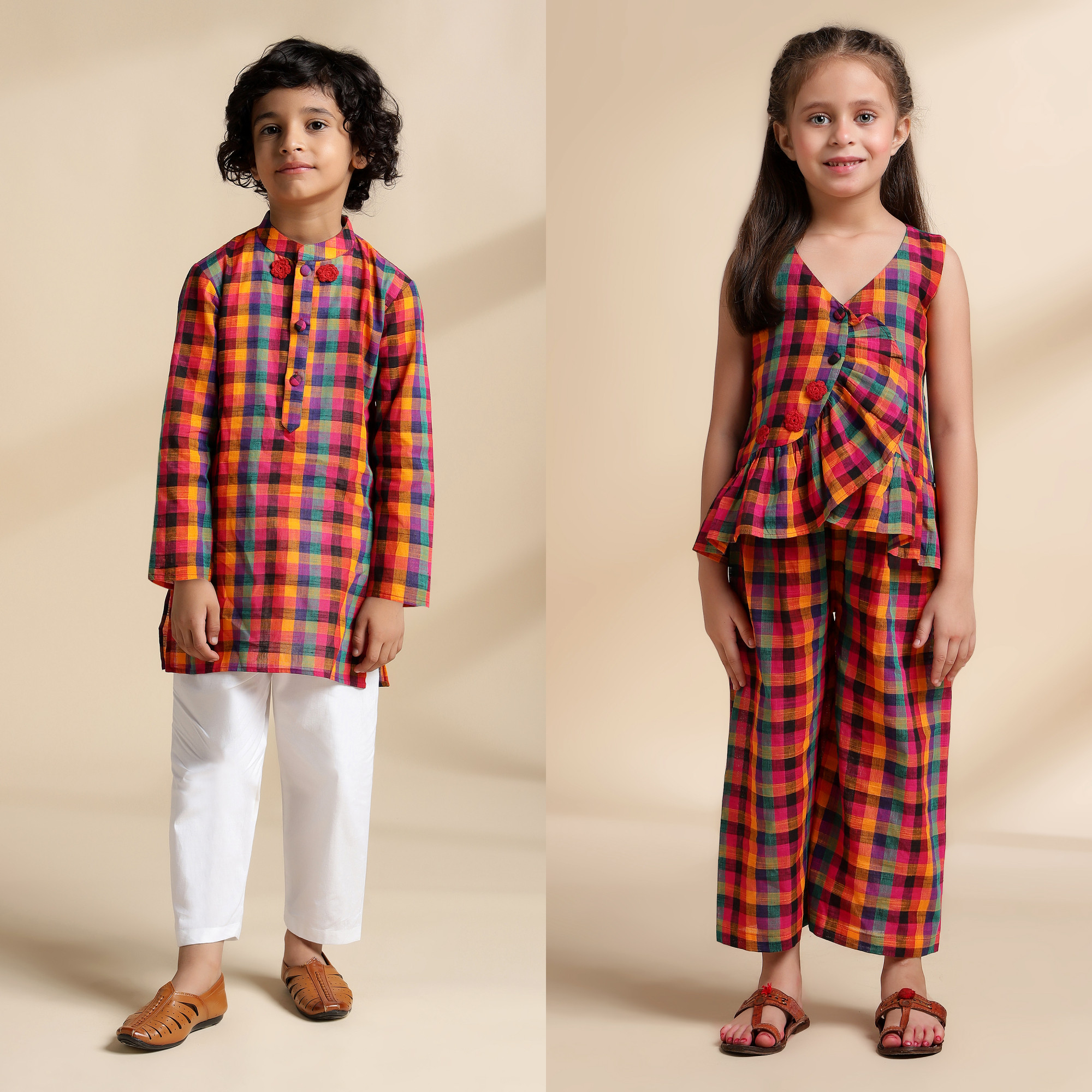Boy's Kurta set of 2: Front button closure in kurta & elasticated pants.
